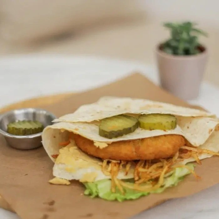 Vegan Schinitzel, Vegan Tortilla Bread, Lettuce, Pickle, Humus, Match Fries, Grilled Carrot With French Freis.