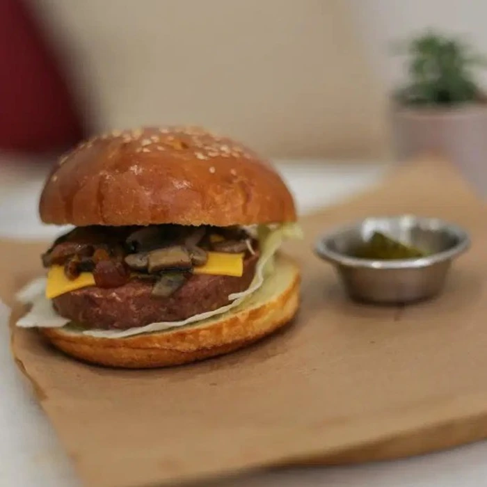 Vegetarian Burger Patty, Cheddar Cheese, Caramelized Onions, Sauteed Mushroom, Lettuce With Fremch Freis.