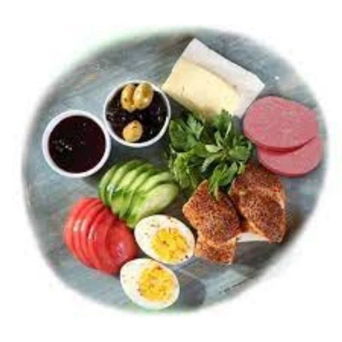 White Cheese, Cheddar Cheese, Burgundy Cheese, Tomato, Cucumber, Honey, Jam, Black Olives, Green Olives, Spring Rolls, Sausage Pan, Butter, Eggs.