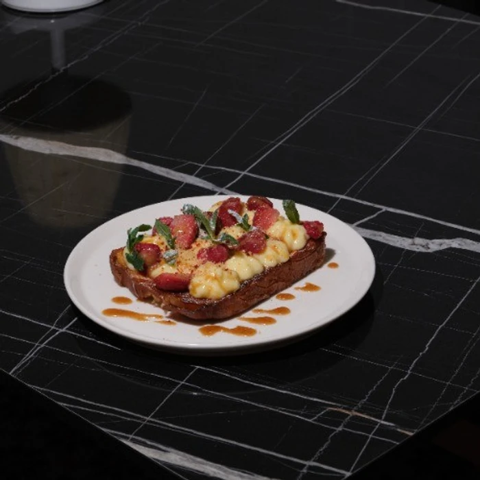 Shokupan Ekmeği Üzerine , beyaz Çikolatalı Süt Kreması , Karamel Sos , Pudra Şekeri , Kırık Bisküvi , Pul Biber , Kırmızı Meyveler , Taze Nane